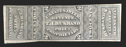 794 O RS139a Image#RS139a, T.J. Husband, 2c Violet on old paper, imperforate, close to large margins all around, strong color, small closed tear at top, very fine appearance; a rare stamp that virtually always comes with faults or repairs. (Image) $2,250.00