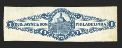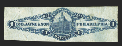 796 og RS144b Image#RS144b, Dr. D. Jayne & Son, 1c Blue on silk paper, mint copy with large part original gum, deep color, small thin, fine appearance; less than a dozen examples have been recorded; ex-Cunliffe. (Image) $3,750.00