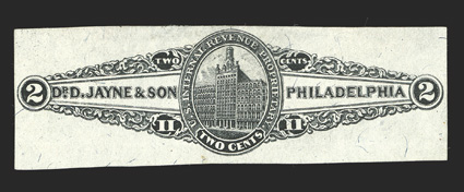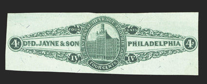 800 O RS146b Image#RS146b, Dr. D. Jayne & Son, 4c Green on silk paper, imperforate, nicely balanced margins, brilliantly rich color, small thin and a light crease, very fine appearance; an attractive example of this rarely offered revenue stamp; ex-Cunliffe. (Image) $2,400.00