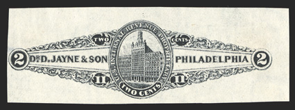798 O RS145b Image#RS145b, Dr. D. Jayne & Son, 2c Black on silk paper, imperforate, full margins all around, bright and fresh, light crease, otherwise a very fine and attractive example of this rare stamp; ex-Cunliffe. (Image) $2,750.00