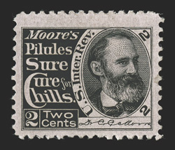 Of all the Match & Medicine stamps, the 2c C.C. Moore on pink paper is one of the most infrequently offered, in fact this is the first example our firm has offered, despite us selling some of the most comprehensive collections to come to the market in the last fifteen years (Donaldson, Combs, Maurer, Reisner, etc.). The Aldrich census records just seven copies. This example, with its excellent centering and freshness, is considered the finest of that miniscule number.