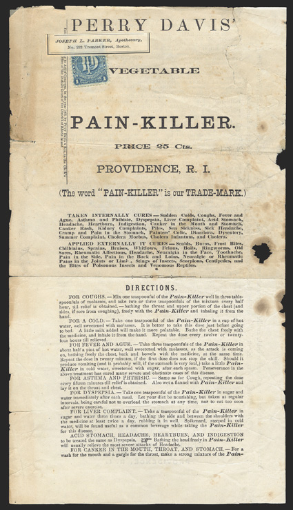 903 p RS75a Image#RS75a, Perry Davis & Son, 1c Blue on old paper, on large wrapper that also served as an information sheet, tied by label of Joseph L Parker, Apothecary, Boston, fine. (Image) Est. $150-200