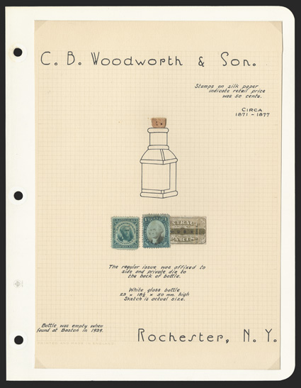 905 p   ImagePerfumery stamps on product labels, a dozen or so items, all on original Henry Holcombe pages, most of these piece were originally on bottles, the stamps and the labels being removed and displayed on the album pages, with Holcombe's notes as to when and where he found the original bottles, mostly Tetlow or Bazin, includes a few collateral items such as a handwritten letter from Wendell Weston regarding the Bazin stamp. (Image) Est. $400-500