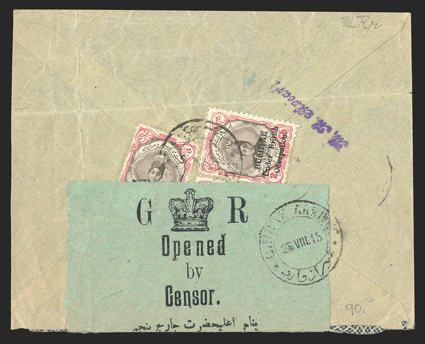 915 c N2 Image#N2, 1915 "BUSHIRE/Under British/Occupation." overprints on 2c Red and sepia, horizontal pair and single tied by indistinct August 1915 bilingual datestamp to cover addressed in Farsi to Chiraz, British bilingual censor seal affixed partly over franking (lifted) and tied by "Chiraz (Arrive)/28 VIII.15" postmark, cover slightly reduced at right, otherwise very fine (S.G. # 2). (Image) Est. $150-200