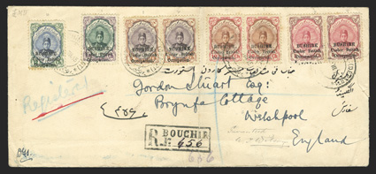 916 c N4/10 Image#N4, N6-8, N10, 1915 "BUSHIRE/Under British/Occupation." overprints on 5c, 9c, 10c, 12c and 24c Ahmad Shah, a spectacular five-color franking by horizontal pairs of 5c, 9c and 10c values and singles of 12c and 24c values tied by bilingual double circle August 1915 "Bushire (Depart)" datestamps to registered legal-sized cover to England, boxed "Bouchir" registry handstamp and red London registry transit backstamp, 12c stamp with gum soak stain at bottom left and cover with trifle heavy vertical pocket fold, otherwise a very fine and rare usage; signed W.T. Wilson (S.G. #4, 6-9). (Image) Est. $1,000-1,500