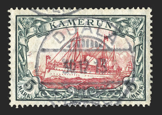 917 O 25 Image#25, 1913 5M Slate and carmine, watermarked lozenges, used with clear "Duala, Kamerun/30.17.13" datestamp, fresh colors, a couple nibbed perfs at lower right and faint trace of a small crease at left, otherwise very fine and rare used; signed Senf (Michel #25; €4,800). (Image) $4,250.00