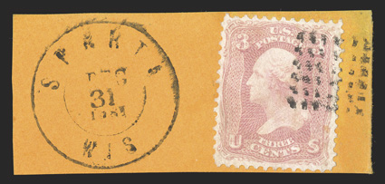 89 p 64 Image#64, 3c Pink, tied to piece by unusual and scarce fancy grid of dots (S-E #SD-G95), with full matching Sparta, Wis. c.d.s. alongside, stamp is exceptionally well centered and with bright Pink color, extremely fine; 2009 PF certificate. (Image) $1,000.00+
