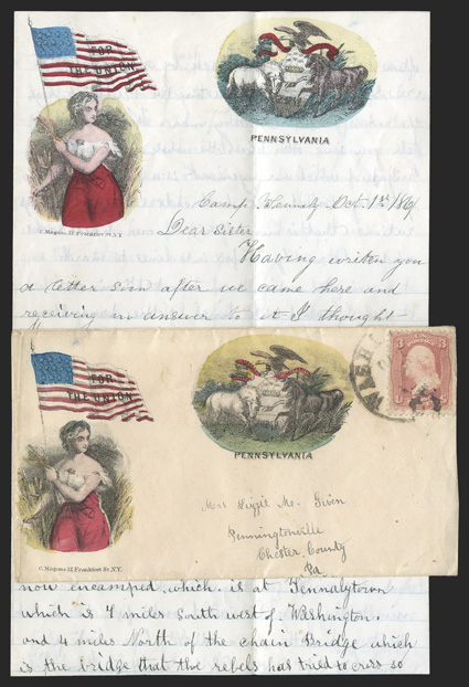 92 c 65 Image#65, 3c Rose, tied by Washington, D.C. c.d.s. on Magnus multicolored Pennsylvania patriotic cover, sent to Chester County, Pa., includes four page letter on matching letterhead from a Union soldier to his sister, the letter is dated Oct. 1, 1861 and mentions Generals McClellan and Scott, and also says he thinks the war will be over by Christmas, the cover is opened at right causing a few blunted perfs. to the stamp, otherwise very fine. (Image) Est. $300-400