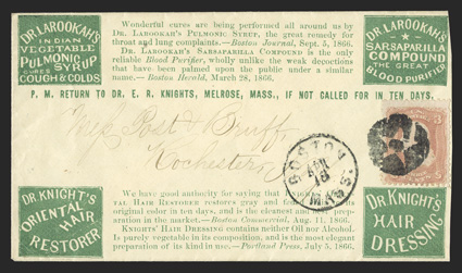 93 c 65 Image#65, 3c Rose, single tied by bold fancy negative five point star cancel to all-over cough syrup advertising cover in green to Rochester, N.Y., matching "Boston/Mass./Apr 18" datestamp alongside, slightly reduced at right, very fine and attractive; 2011 PF certificate. (Image) Est. $300-400