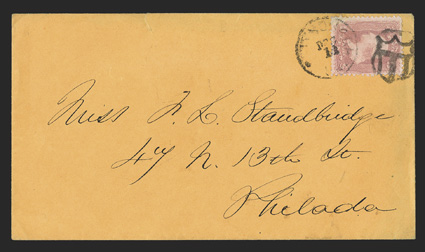 94 c 65 Image#65, 3c Rose, single centered clear of design, tied by well struck fancy shield cancel and partial Pittsburgh datestamp to buff cover to Philadelphia, trivial opening tear at top, fresh and very fine; 2011 PF certificate. (Image) Est. $200-300