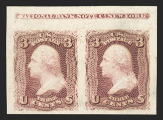 95 og 65c Image#65c, 3c Rose imperforate, a striking horizontal pair, being a top margin pair with full NBNC imprint, huge margins all around, strong color and a sharp impression, lightly hinged, extremely fine; certainly among the finest quality pairs available; 2001 and 2004 PF certificates. (Image) $1,000.00