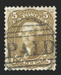 96 Ou 67 Image#67, 5c Buff, used, exceptionally well centered, strong color and a well defined impression, neatly struck large Boston Paid cancel, extremely fine; a choice example of this notoriously difficult stamp; 2008 PSE certificate (VF-XF 85; SMQ $1,700.00). (Image) $1,150.00