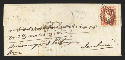 1026 c SG #12 ImageS.G. #12, 1854 1a Red, die 1, pos. 75, single with ample to huge margins, just tied by diamond of dots cancel to cover from Bombay to Jaulnah, reverse with red boxed "Bombay/9 Oct 1854/Paid" postmark and red boxed "Jaulnah/11 Oct 1854/Paid" arrival postmark, very fine early usage. (Image) Est. $150-200