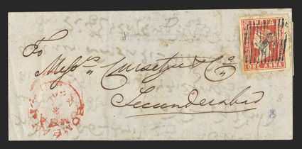 1027 c SG #13 ImageS.G. #13, 1854 1a Deep red, die II, pos. 52 from "D" stone, single with large margins all around, tied by "1" in diamond of parallel lines of the Bombay Head Post Office (Renouf ty. 4f) to small cover to Secunderbad, red Bombay datestamp and 1855 Secunderbad backstamp, extremely fine. (Image) Est. $150-200