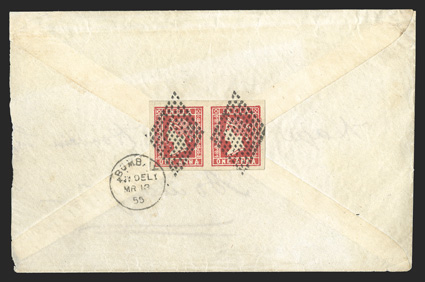 1028 c SG #13 ImageS.G. #13, 1854 1a Deep red, die II, a superb horizontal pair, featuring lavishly large even margins all around, luxuriant color and a strong impression, tied to reverse of locally addressed cover by well struck diamond of dots cancellations (Cooper ty. 1) and matching thimble "Bombay/4 IV Dely/Mr 13, 55" datestamp, cover slightly reduced at right, still extremely fine and strikingly handsome. (Image) Est. $300-400