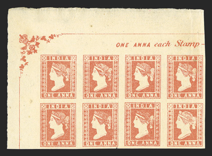 1029 ogbl SG #14 ImageS.G. #14, 1854 1a Dull red, die II, without gum as issued, an especially handsome top left corner margin mint block of eight (4x2), with full sheet selvages showing the corner ornament and part imprint, other two margins large and even, wonderfully fresh, with bright color on crisp clean paper, top right stamp with a small thinned spot, otherwise extremely fine; a desirable multiple from stone "D" showing retouches on pos. 2, 3 and 11. (Image) for singles £640