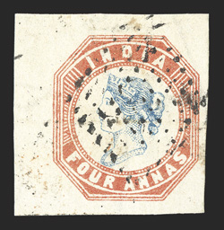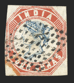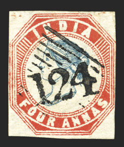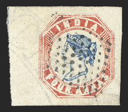 1036 O SG #19 ImageS.G. #19, 1854 4a Blue and red, 2nd printing, head die II, frame die I, single with watermark inverted and reversed from pos. 1, four ample to clear margins, Bombay "1" in diamond of dots cancel, fine; 2000 BPA certificate. (Image) £400