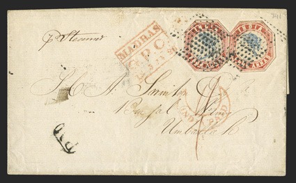 1033 c SG #18 ImageS.G. #18, 1854 4a Blue and pale red, 1st printing, head die I, frame die 1, two singles cut to shape but each with margins all around, tied by diamond of dots cancels to 1855 folded cover from Madras to a member of the Bengal Army at Umballa, ms. "pr Steamer" directive, red boxed Madras datestamp and matching "India Paid" in crescent, red circular and boxed Calcutta transit backstamps, showing an additional 3a being levied, red Umballa backstamp and boxed "PM" handstamp indicating late delivery, fresh and very fine; an unusual domestic usage of two 4a lithographed stamps; 2011 RPS certificate. (Image) Est. $400-500