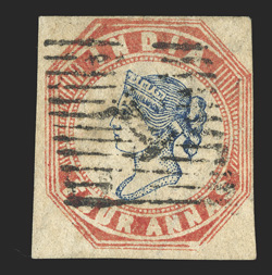 1034 O SG #19 ImageS.G. #19, 1854 4a Blue and red, 2nd printing, head die II, frame die I, an extraordinary used single, boasting extravagantly wide margins all around, including showing the blue wavy line dividing line at left, top and partially at right, wonderfully fresh, with rich colors on immaculate paper, light diamond of dots cancel, an extremely fine gem; a nicer example would be a challenge to locate. (Image) £400