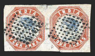 1047 O SG #25 ImageS.G. #25, 1855 4a Blue and rose-red, 5th printing, head die III, frame die II, pos. 3-4, horizontal pair showing the intermediate setting, used with "B/1" in octagon postmark of Calcutta, ample to mostly large margins all around, strong colors, very fine and desirable. (Image) £2,500