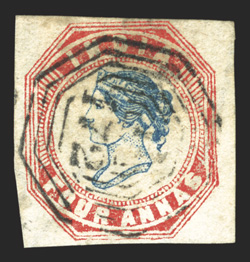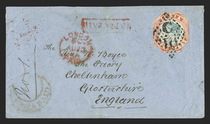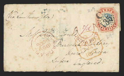 1056 c SG #36 ImageS.G. #36, 1855 8a Carmine on blue glazed paper, die I, tied along with ½a Pale blue, 1a Brown and 2a Dull pink (S.G. #38, 39, 41) by Calcutta datestamps and "B/1" in octagon cancels (Renouf Ty. 7a, without the outermost octagon) to 1861 cover to Boston, "per Str. Nemesis/via Marseilles" directive, oval "Forwarded By/Goddard & Co./Calcutta" handstamp on reverse, red boxed "INDIA PAID" handstamp, red London transit and ms. "1/6" credit, "Boston Am. Pkt./Oct 4" backstamp, red "16/cents" credit and "5" due for local delivery, very fine and handsome four-color franking as well as being a very scarce cancellation. (Image) Est. $200-300
