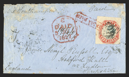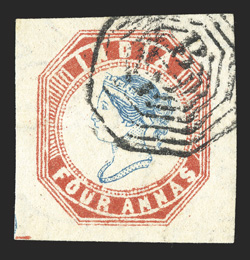1042 c SG #23 ImageS.G. #23, 1855 4a Blue and red, 4th printing, head die III, frame die II, cut to shape and tied by "C/10" in diamond of dots cancel of Bangalore to blue cover to Cheltenham, England, red Bangalore origin and Bombay backstamps, Bombay red boxed "India Paid" as well as Madras "India Paid" in crescent handstamps, red "London/Paid/Au 13 58" arrival postmark, very fine. (Image) Est. $400-500