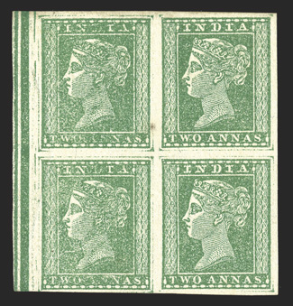 1051 ogbl SG #31 ImageS.G. #31, 1854 2a Green, without gum as issued, left sheet-margin mint block of four, with ample to mostly large margins on the other three sides, bright and fresh, top left stamp with a small inclusion at lower right, very fine and attractive (Scott #5; $480.00 for singles). (Image) for singles £520