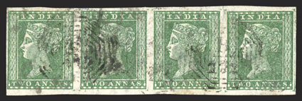 1052 O SG #31 ImageS.G. #31, 1854 2a Green, horizontal strip of four, ample to large margins all around, cancelled by two strikes of "B/172" in octagon postmark of Singapore (S.G. #Z64), very fine and scarce multiple; 2011 Sismondo certificate. (Image) for singles £380