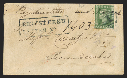1053 c SG #31 ImageS.G. #31, 1854 2a Green, margins to touching at right, tied by "1" in diamond of parallel lines cancel of Bombay to registered cover to Secunderbad, boxed "REGISTERED/LETTER No." handstamp and ms. "1403" as well as manuscript "Registered Letter and Stamped" endorsement at top, red 1855 Bombay and Secunderbad backstamps, very fine. (Image) Est. $150-200