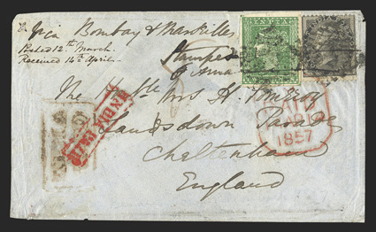 1054 c SG #31 ImageS.G. #31, 1854 2a Green, ample to large margins all around, tied along with 1856 4a Black (S.G. #45) to cover from Benares to England, manuscript "Via Bombay & Marseilles" directive, two different red boxed "INDIA PAID" handstamps, red 1857 tombstone "Paid" entry handstamp with ms. "8"d due, Benares, Bombay and Cheltenham backstamps, very fine mixed issue franking. (Image) Est. $300-400