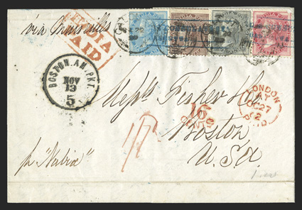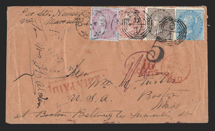 1059 c SG #38, 39, 46, 48 ImageS.G. #38, 39, 46, 48, 1856 ½a Pale blue, 1a Brown, 4c Grey-black and 8a Carmine, singles of each cancelled by blue rectangular boxed "U.S. Consulate/Calcutta" handstamps and tied by four strikes of "Calcutta/22 Sp, 62" datestamps to folded letter to Boston, "Via Marseilles" and "pr Nubia" directives, red boxed "INDIA/PAID" handstamp of Bombay, red "London, Paid/Oc 27, 62" transit with ms. "1/7d" credit, arrived in Boston with red "16/cents" credit handstamp and "Boston Am Pkt./5/Nov 13" entry postmark, horizontal filing crease at top affecting the adhesives, otherwise a very fine and handsome four-color franking usage. (Image) Est. $200-300