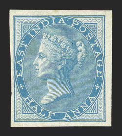 1044 O SG #25 ImageS.G. #25, 1855 4a Blue and rose-red, 5th printing, head die III, frame die II, an especially handsome used example, possessing uncommonly wide margins all around and being beautifully cancelled by light "1" in diamond of parallel lines cancel of Bombay, lovely fresh colors on crisp white paper, extremely fine and choice; signed Buhler and Holcombe. (Image) £550