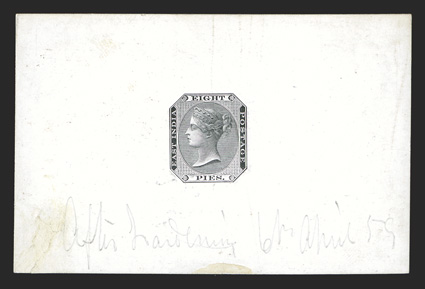 1069 P SG #51P ImageS.G. #51P, 1860 8p Black die proof on glazed card, 92x60mm, with pencil notation "After Hardening 6th April 59" at bottom, fresh and very fine; ex-Kor-I-Nor. (Image) Est. $300-400