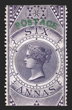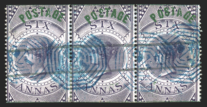 1075 O SG #66 ImageS.G. #66, 1866 6a Purple Foreign Bill fiscal stamp overprinted "Postage" in green, scarce horizontal strip of three, used with several strikes of blue "B/1" in octagon of Calcutta and ms. strokes, rich luxuriant color on fresh paper, a few reinforced perf. separations at bottom between the left pair, very fine (Scott #29; $420.00 for singles). (Image) for singles £420