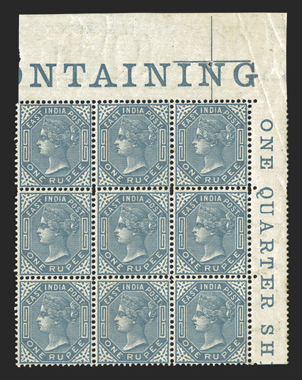 1077 nhbl SG #79 ImageS.G. #79, 1874 1R Slate, handsome top right corner sheet-margin mint block of nine with partial imprints, exceptionally well centered for this, deep rich color, crisp and intact, o.g., l.h. in the selvage only, the stamps all n.h., extremely fine (Scott #35; $585.00 for hinged singles). (Image) for hinged £585+