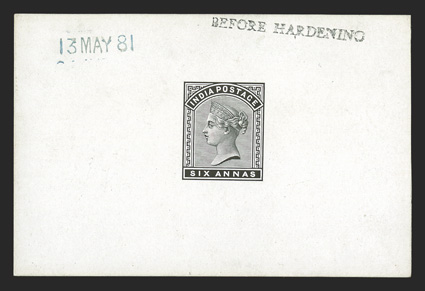 1079 E   Image1882 6a Black essay die proof on glazed card, 92x60mm, stamped "13 MAY 81" and "BEFORE HARDENING," fresh and extremely fine; this 6a value was prepared to replace the 1876 issue, but never produced. (Image) Est. $300-400