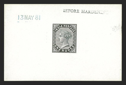 1080 P SG #101P ImageS.G. #101P, 1883 1R Black die proof on glazed card, 92x60mm, stamped "13 MAY 81" and "BEFORE HARDENING," fresh and extremely fine. (Image) Est. $300-400
