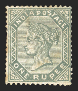 1082 og SG #101 var. ImageS.G. #101 var., 1883 1R Slate, Khundo Sakharam postal forgery type 2, unused without gum as made, small perf. fault at left, otherwise fine. (Image) Est. $100-150