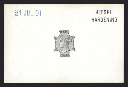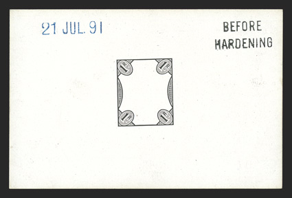 1086 P SG #105P ImageS.G. #105P, 1892 1R Black frame only die proof on glazed card, 92x60mm, stamped "21 JUL 91" and "BEFORE HARDENING," fresh and extremely fine. (Image) Est. $300-400
