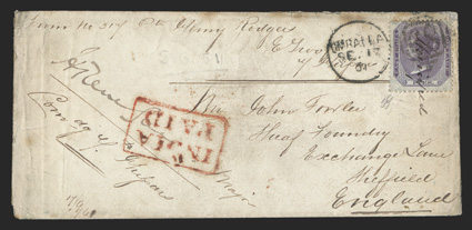 1088 c SG #51 ImageS.G. #51, 1860 8p Purple on bluish, single tied by "Umballa/Se 17, 61" duplex postmark and ms. "Stamped" to cover to England, endorsed "From no 317 Pt Henry Rodgers/E Troop" and countersigned by his commanding officer, enabling it to travel at the concessionary rate for military personnel, red boxed "INDIA/PAID" handstamp and Indore, London and Sheffield backstamps, cover with a few minor edge stains at top, very fine; a desirable usage of the scarce 8p on bluish paper as it is seldom found in its intended use on soldier's letters; 2001 Sismondo certificate. (Image) Est. $300-400