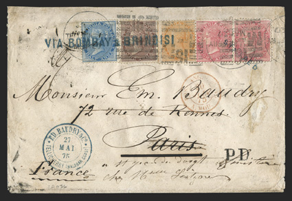 1089 c SG #54, 60,61, 74 ImageS.G. #54, 60, 61, 74, 1856-68 ½a Blue, die I, 1a Chocolate, 2a Yellow and 8a Pale rose, die II, singles of the first three and 8a horizontal pair, tied by "Tellicherry/May 27/16/M-14" duplex postmarks to cover to Paris, "Via Bombay & Brindisi" handstamped directive, nine backstamps indicating transport via rail from Salem on 28 May to Sholapore, arriving with their 30 May traveling post office marking, then Bombay on 31 May, then Pairs on 21 June and forwarded to St. Jean du Doigt, very fine; an attractive four-color franking paying the triple rate. (Image) Est. $500-750