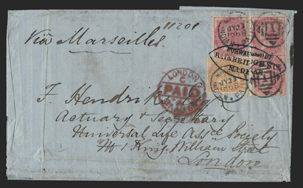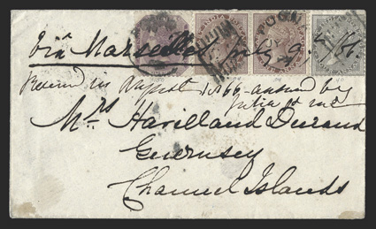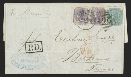 1093 c SG 69 ImageS.G. #69, 1866 4a Green, single tied along with two 8p Purple (S.G. #52, one light stain), by "Kurrachee/18 Ju, 70" duplex postmark to folded letter to Bordeaux, clear blue double oval "Forwarded By/Jemsetjee Rustomjee/Kurrachee" handstamp across the stamps and repeated at bottom left, "Via Marseilles" directive, boxed "P.D" handstamp and red French entry c.d.s., Bombay and Bordeaux backstamps, very fine; this forwarding agent is not recorded by Rowe. (Image) Est. $150-200