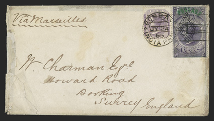 1091 c SG #66 ImageS.G. #66, 1866 6a Purple Foreign Bill fiscal stamp overprinted "Postage" in green, single tied along with 8p Purple on white (S.G. #52) by bold double circle "Bombay, India Paid/Jy 24, 66" duplex postmark and ms. strokes to cover to England, "Via Marseilles" directive and Dorking backstamp, cover with mended opening tears at left, otherwise a very fine and scarce usage (Scott #29; $700.00). (Image) Est. $500-750