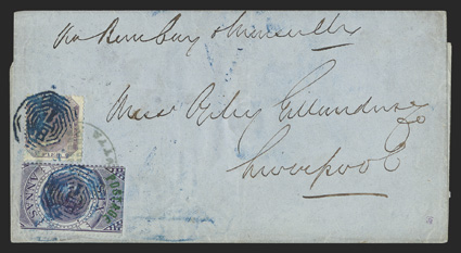 1092 c SG #66 ImageS.G. #66, 1866 6a Purple Foreign Bill fiscal stamp overprinted "Postage" in green, single tied along with 8p Purple on white (S.G. #52) by blue "B/1" in octagon of Calcutta and oval Gillanders, Arbuthnot & Co. forwarding agents handstamp to folded cover to Liverpool, "Via Bombay & Marseilles" directive, Calcutta November 21 1866 and Liverpool backstamp, very fine and scarce usage (Scott #29; $700.00). (Image) Est. $500-750