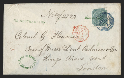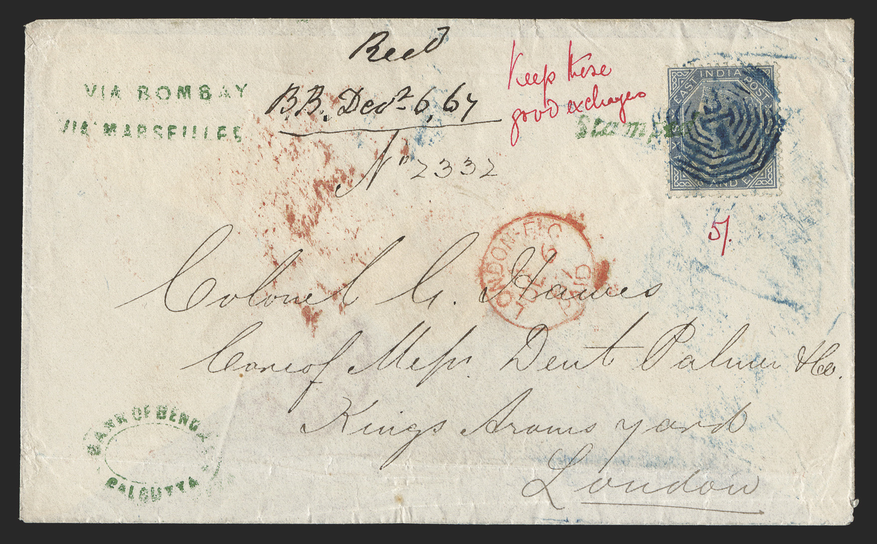 1094 c SG #69, 72 ImageS.G. #69, 72, 1866-67 4a Green, die 1 and 6a8p Slate, singles of each tied by blue "B/1" in octagon cancels of Calcutta and green "Stamped" security handstamps to separate 1867 covers from the same correspondence to London, these being a bank letter and a duplicate letter sent by different routs to insure the receipt of at least one, the 4a cover with "Via Southampton" directive and the 6a8p cover with "Via Bombay/Via Marseilles" directive, both with red "Calcutta/No 8, 67" backstamps, 6a8p with London Dec. 6 receiver and marked "Keep these good exchanges" and 4a with Dec. 11 receiver and no notations, very fine; an interesting pair showing that the Marseilles route was both faster and more expensive. (imagea) (Image) Est. $200-300