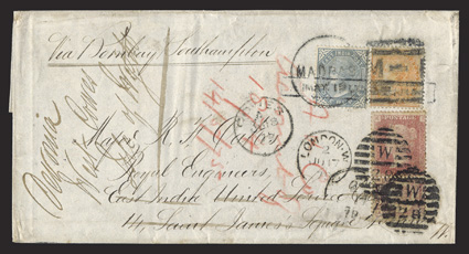 1096 c SG #79 ImageS.G. #79, 1874 1R Slate, tied along with 2a Brown-orange (S.G. #63) by "Madras/May 15" duplex postmark to 1875 folded cover to London, "Via Bombay & Southampton" directive, London backstamp, forwarded to West Cowes, Isle of Wight with Great Britain 1d Rose-red, plate 147 and ½d Rose-red (S.G. #43, 48) tied by "London/Ju 17, 75" duplex postmarks, Cowes arrival postmark, a very fine and desirable mixed country franking with the scarce 1 Rupee issue. (Image) Est. $500-750