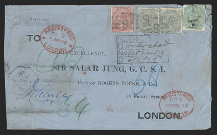 1097 c SG #79 ImageS.G. #79, 1874 1R Slate, horizontal pair tied along with 4a Green, die I and 8a Pale rose, die II (S.G. #69, 74) by Hyderabad duplex postmarks to 1876 registered Salar Jung correspondence cover to London, printed "Via Brindisi" directive, boxed registry handstamp, red oval London registry receiving datestamps, cover with opening tear at top and stamps with small faults, nevertheless a very scarce usage of the 1 Rupee value. (Image) Est. $300-400