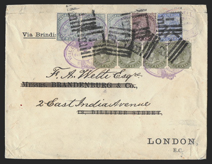 1098 c SG #101 ImageS.G. #101, 1883 1R Slate, horizontal pair and single, tied along with 1a Brown-purple, 2a Pale blue and 4a Olive-green horizontal strip of four (S.G. #88, 91, 95) to 1889 cover from Bombay to London, printed "Via Brindisi" directive, Sea Post Office and London backstamps, very fine and scarce four-color franking paying the 5½ oz. rate. (Image) Est. $150-200