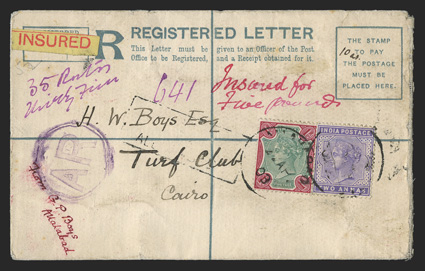 1099 c SG #106 ImageS.G. #106, 1892 1R Green and aniline-carmine, single tied along with 2a Pale violet (S.G. #116) to 2a Registered envelope to Cairo, Egypt by 1903 Allahabad datestamp, boxed Allahabad registry handstamp, violet "AR" (Advice of Receipt) handstamp, "Insured" label affixed at top left and red ms. "Insured for Five Pounds" notation, backstamped, very fine; an unusual usage of the elusive 1R bi-colored issue. (Image) Est. $100-150