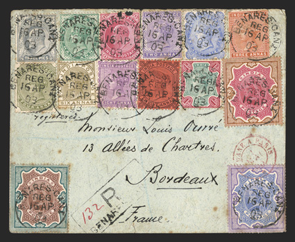 1100 c SG #107-09 ImageS.G. #107-09, 1895 2R-5R Victoria, singles of each along with eight other different Victoria values and two Edward values that were available to the sender in 1903, all tied by Benares datestamps to registered cover to Bordeaux, red Paris transit and Sea Post Office and Bordeaux backstamps, opening tear at top center and a couple stamps with a small fault or toned spot, fine; though a philatelic usage, the Victoria high values are seldom found on covers. (Image) Est. $200-300